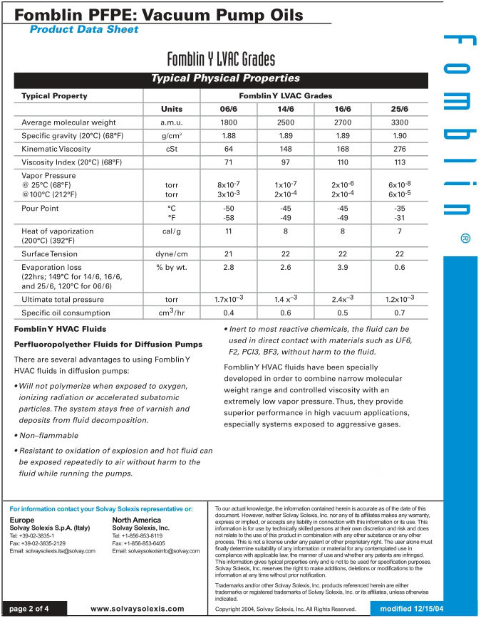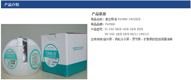 應(yīng)用領(lǐng)域: 旋片泵、渦輪分子泵、羅茨泵、擴散泵的密封潤滑油 · 在與氧氣、離子輻射物、亞原子微粒接觸時不會發(fā)生聚合反應(yīng)。整個運行系統(tǒng)可以避免任何分解物留下的沉淀。 · 不可燃性 · 抗氧化性 在泵運行時,熱的全氟聚醚液即使多次暴露于空氣中也不影響其特性。 · 化學(xué)穩(wěn)定性 和UF6,F2,PCI3,BF3材料接觸使用時,不會發(fā)生任何化學(xué)反應(yīng)。 · Fomblin Y HVAC 液具有緊密的分子重量值,而且它的低蒸發(fā)壓力可以有效控制粘度。因此在高真空條件下非常適用,也特別適用于與汽油頻繁接觸的系統(tǒng) |