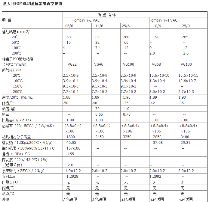 Fomblin Y 等級的全氟聚醚液主要是用作真空泵的潤滑劑。全氟聚醚液是氟聚合物的混合體。氟聚合物是在光化學(xué)過程下提取的,最早的狀態(tài)是六氟丙烯。因為Fomblin的化學(xué)反應(yīng)元素只包括碳、氟、和氧原子,所以這些全氟聚醚液產(chǎn)品具有一些額外的特性: · 低蒸氣壓 · 化學(xué)惰性 · 熱穩(wěn)定性高 · 卓越的潤滑性能 · 無閃點,無燃點 · 毒性低 · 與金屬、塑料、橡膠的兼容性 · 抵抗水解和非水液體的溶解 · 絕緣性能高 · 表面張力小 · 輻射穩(wěn)定性好 · 無環(huán)境污染